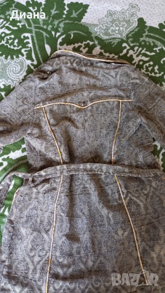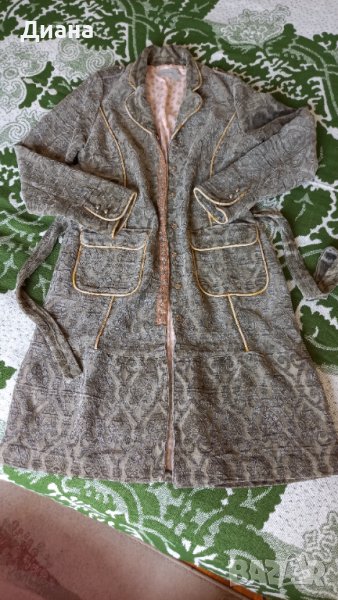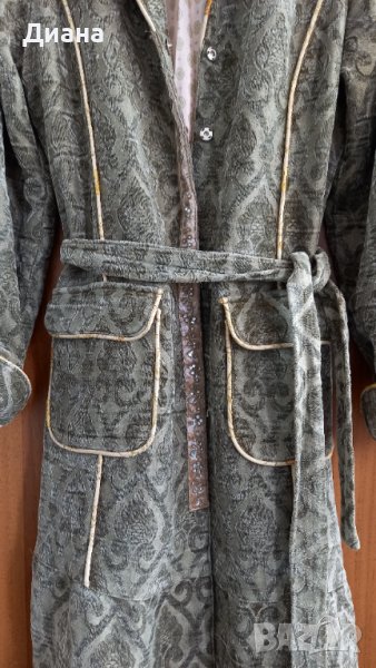 Оригинално марково палто/манто от релефно кадифе и характерни апликации. Има хастар, колан, два джоба, закопчаването е тик-так. Разкроеният бордюр долу и маншетът, който се обръща, го правят особено елегантно.