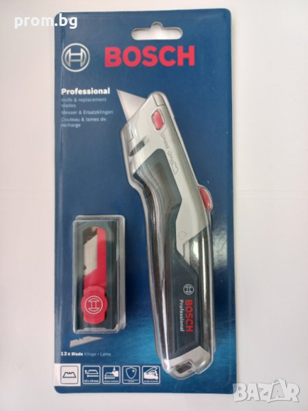Bosch професионален макетен нож (син цвят), скалпел, резец, внос от Германия. С плъзгач за отваряне и затваряне. Комплектът включва 3 бр. двустранни ножчета, намиращи с в задната част на дръжката и 10 бр. двустранни ножчета в кутия. Ергономична форма и здрав алуминиев корпус. С функция за заголване на кабели. Размери: 21 x 10.6 x 2.5 cm; тегло 137 гр.
