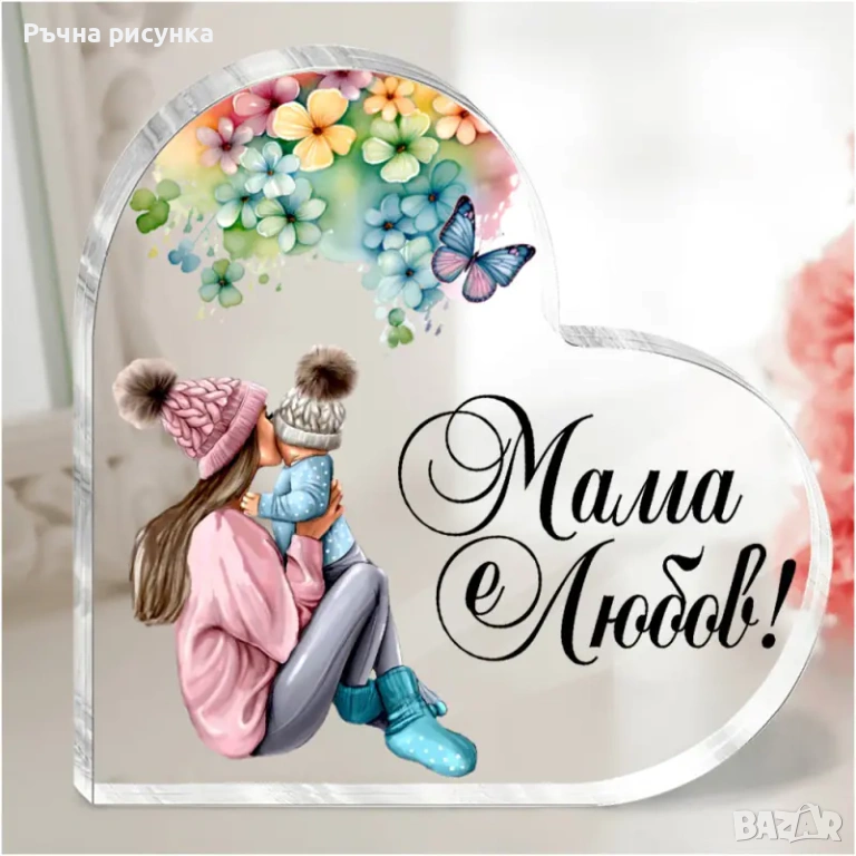 Седемнадесета снимка-Акрилно сърце "Мама е любов!" с послание /настолно/.