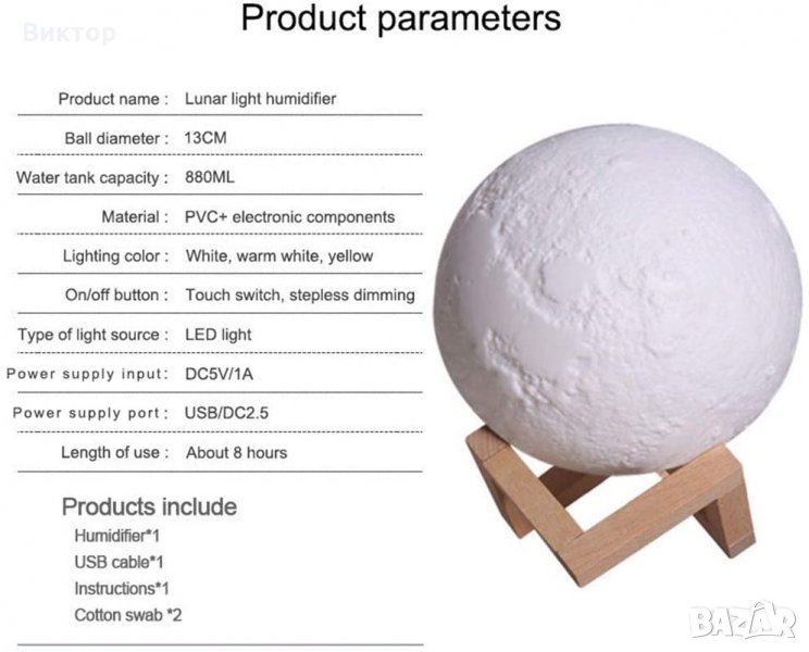 Нощна лампа тип дифузер и овлажнител свети в различни цветове. С реалистичната си 3D форма копира истинския релеф на Луната, и лампата преминава през всички нейни фази със сменящи се режима на светене чрез докосване. Светлината и е мека и ненатрапчива. Осигурява приятна, успокояваща атмосфера.