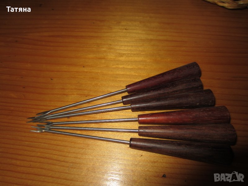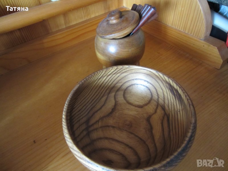 СНИМКИ 1-3 ; Изработени са от масивно дърво.Приборите за маслини -15 € ; купата - 26 € ,саханчето - 15 €