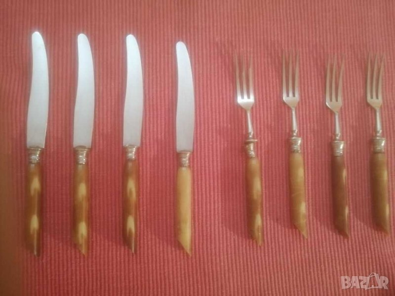 Комплект стари прибори Solingen, четри ножчета и четри вилички с бакелитни дръжки. Маркировките са видими на снимките.