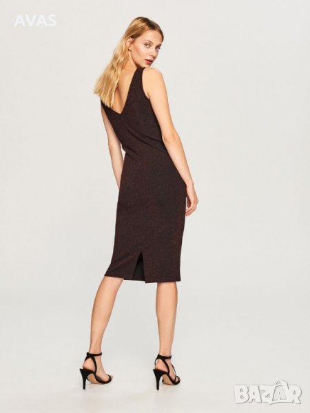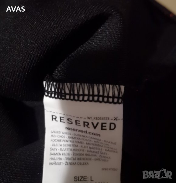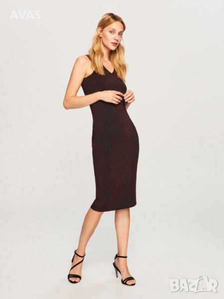 Нова рокля на Reserved с етикет, платът е черен, отгоре е с тъмно червен блясък от метализирана нишка. С презрамки, без ръкави, с малка цепка отзад, под коляното дължина. От вътрешната страна е черна