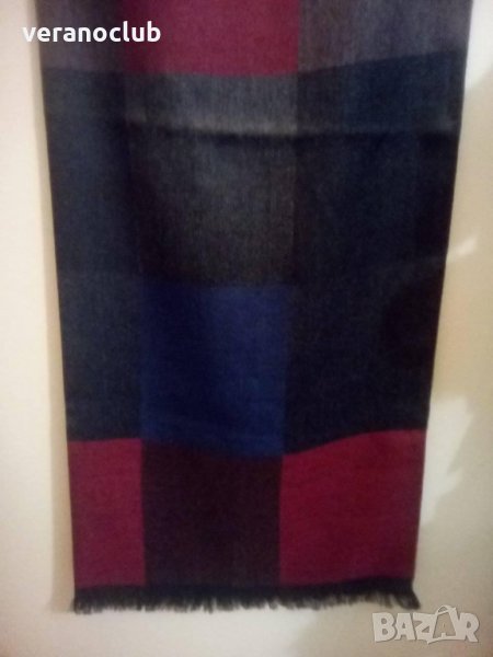 Стилен шал от вискозна смес с много добри показатели. Модерно оформен с геометрични фигури - класически квадрати в студени тонове - син, червен, сив. Авангарден голям правоъгълен шал със загатнати ресни.
