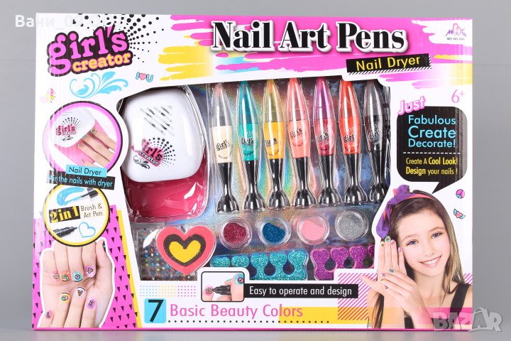 Комплектът за маникюр съдържа сушилня за бързо съхнене на лака, 4 кутийки с брокат, двустранна пила във формата на сърце, 7 лака с четка и писец за рисуване върху лака, лепенки за нокти, самозалепващи се камъчета и 2 броя разделители за пръсти. Комплектите за маникюр са винаги желан подарък. Децата ще се забавляват и ще си направят желания маникюр с рисунка и декорация по собствен вкус.