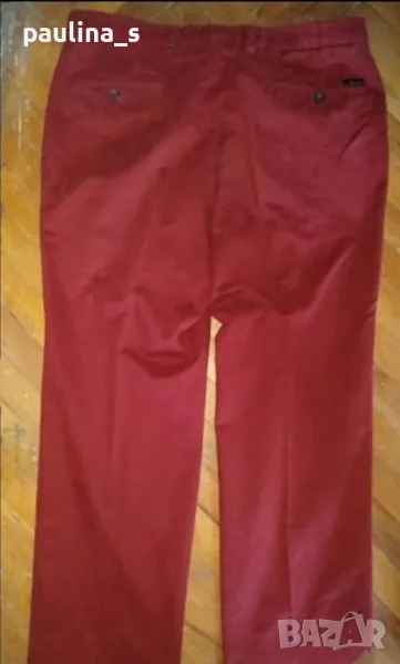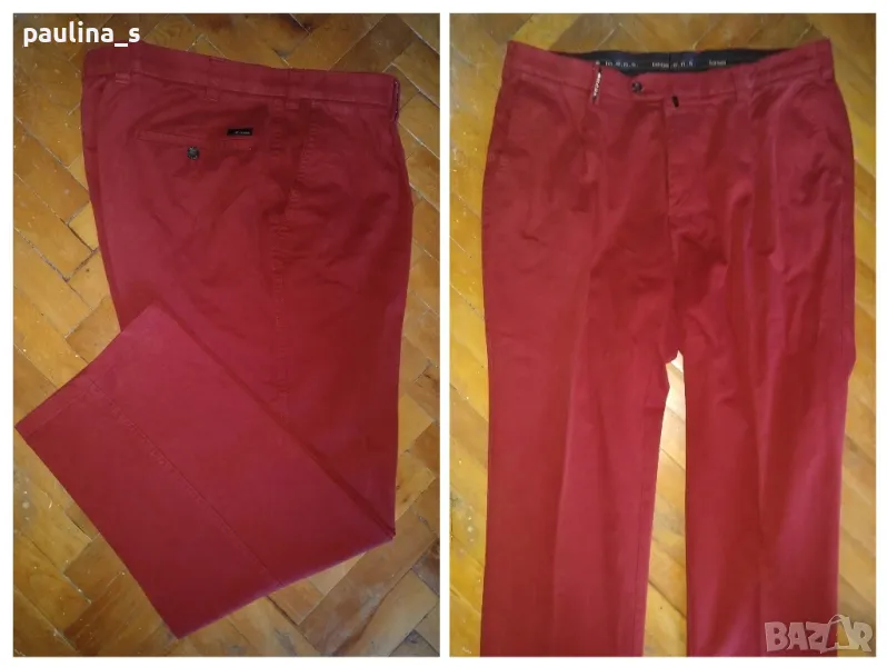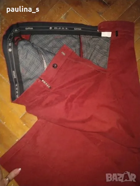 4. Колаж / Мъжки брандов панталон "m. e. n. s.". Цената е крайна 39,99лв. Мъжки брандов панталон от дънков плат с 2%еластан. Цветът е тъмночервен до брик, моделът е класически с басти, коси джобове, нормално широки крачоли. Префектна изработка, в денди стайл. Много тарикатска дреха, без дефекти и етикет, като нова.