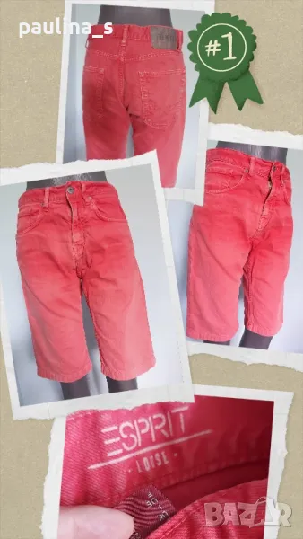 2. Колаж / M / L - "Esprit". Цената е крайна 24,99лв. Превъзходни дънкови бермуди в цвят "Корал" с избелващ ефект. Моделът е "5 pocket Denim" standard, без еластичност на плата. Джобовете са дълбоки и може да се носят от двата пола. Изключително атрактивна за окото дреха. Без дефекти и етикет, като нови.