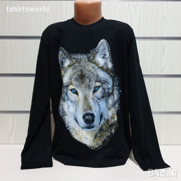Нова детска блуза с дълъг ръкав с трансферен печат Вълк със сини очи, Серия Вълци