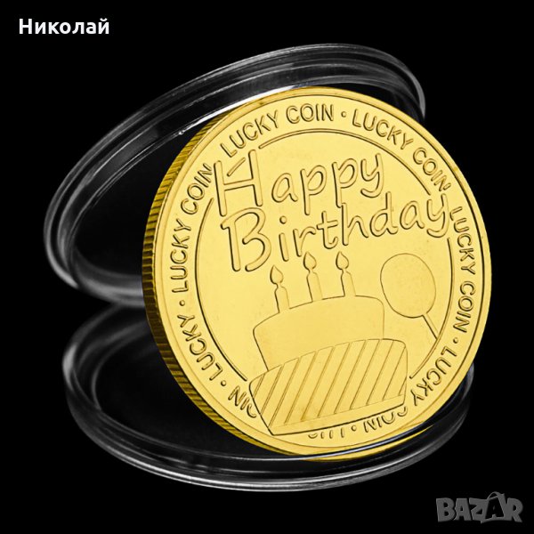 Късметлийска монета за рожден ден + предпазна капсула . От предната страна е изобразена торта с надпис Happy Birthday . От задната страна са изобразени подкова с детелина и пожелание за здраве , любов и щастливи моменти . Монетата е подходяща за подарък за рожден ден .