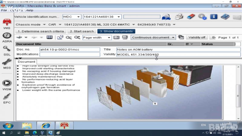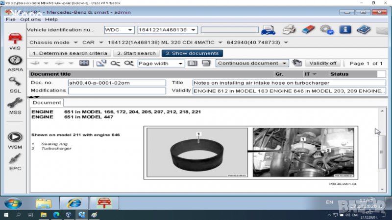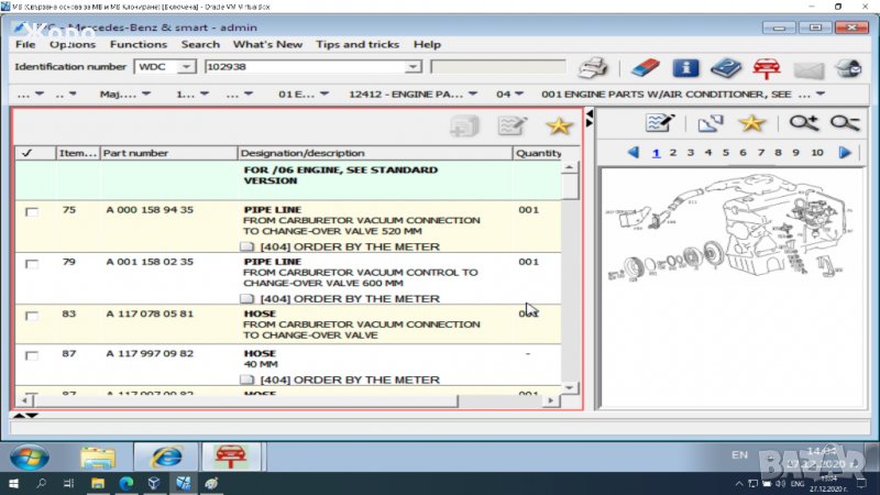 Предлагам техническа база данни за ремонт на Мерцедес концерна до края на 2019 г. Базата данни съдържа данни за времена на ремонти,технически характеристики и спецификации, електрически схеми, графики с подробни данни за настройка на системите на автомобила,диаграми, точни описания и последователност на операциите по ремонта. Базата данни покрива УНИМОГ гамата на мерцедес, всички камиони, всички автобуси, SMARТ автомобилите, тежкотоварни и лекотоварни транспортери. . Програмата е лицензирана и не се нуждае от активация . Освен техническата документация към програмата има инсталиран и активиран електронен каталог с парт номера на частите на всички автомобили.