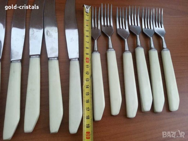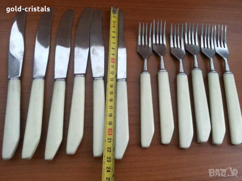 Руски прибори за хранене 6бр вилици 6бр ножове съветски ссср маркирани неръждаеми без забележки без пукнатини по дръжките сервиз комплект сет лот ретро арт декор винтидж колекция стари антикварни предмети обзавеждане за дома и семейството подходящи за подарък за ценители и колекционери посуда кухня готвене сервиране хранене вилици лъжици лъжички вилички ножове салфетки подарък гости трапезария маса празници кухня маса