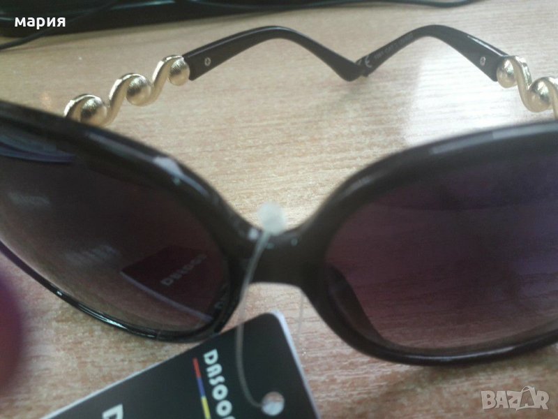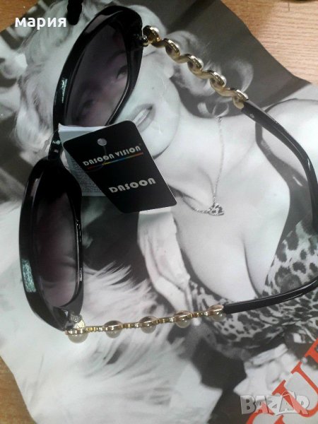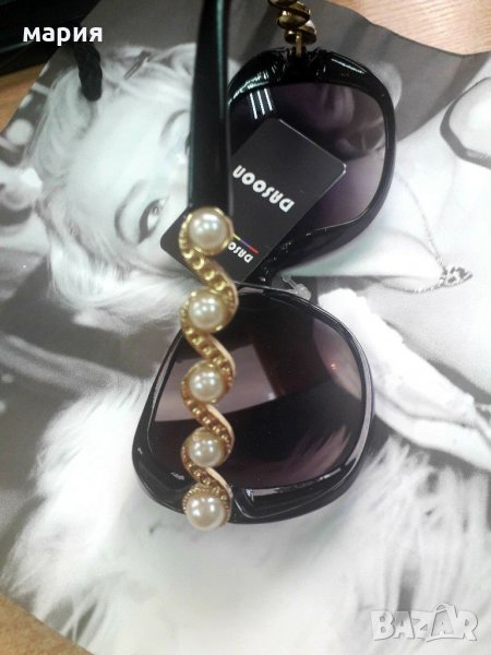Красиви и стилни дамски слънчеви очила с инкрустирани перли на рамката.Чисто нови,с етикет.Имат UV защита.Черни рамки,преливащи стъкла.Стоят страхотно.Едно изискано бижу на Вашето лице.