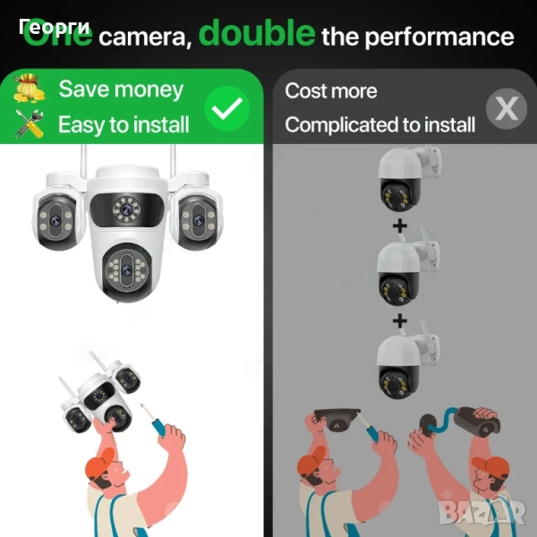 Това е тройна камера с високо качесво на изображение с 6 mp. стандарт за камери. Има вграден auto tracking за следене на вижещи обекти. Двупосочен интерком, т.е. можете да чувате, какво се говори около камерата, а също така можете и вие да говорите от смартфона или таблета си и намиращите се до нея,