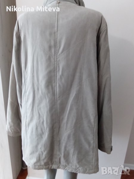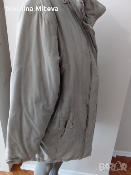 Якето с горна част от пясъчна коприна, ватирано. за всеки случай давам размерите : рмене - 44см , ръкав - 56 см , подмишници - 60 см , дължина - 88см. Толкова евтино е защото липсва едно копче инече е запазено и няма друге забележки.