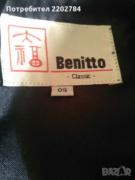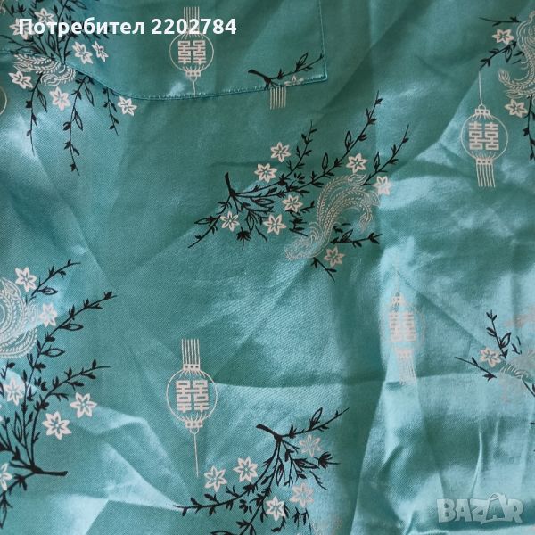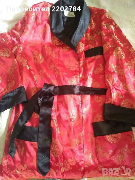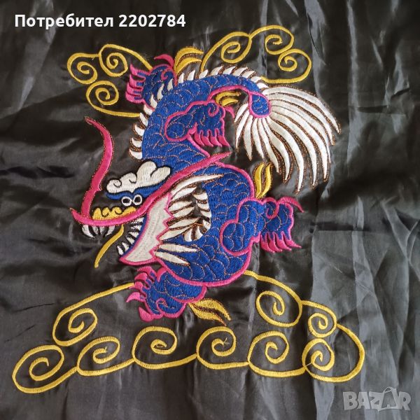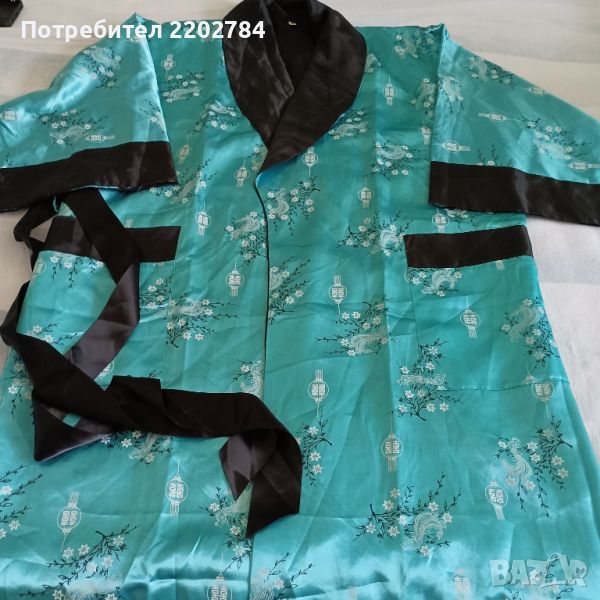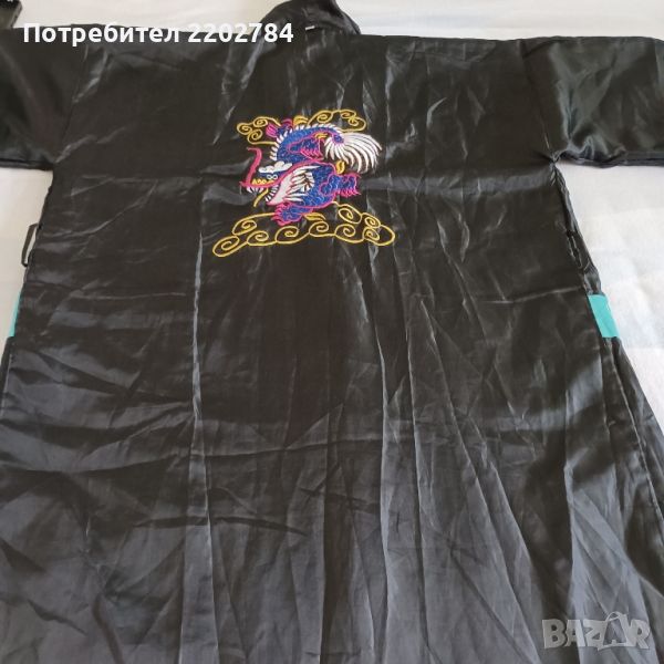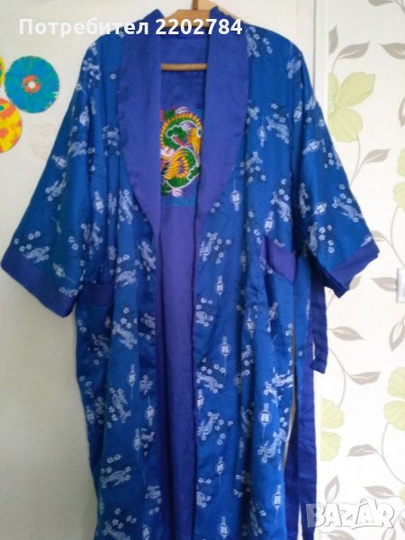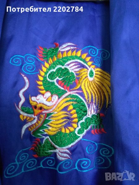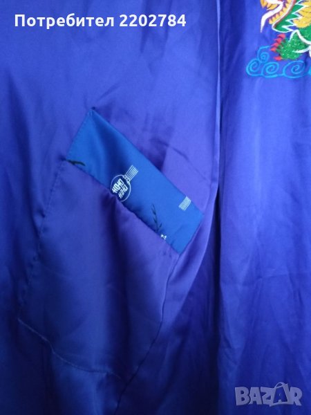 Втория халат не е на марката ,,Benitto" но също е много красив.Кралско синьо с бели орнаменти и голяма бродерия на дракон от вътрешната страна на гърба.Гръдна обиколка 130см.Дължина 120см