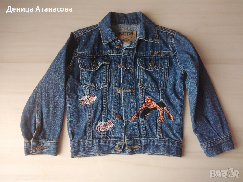 4) тънко дънкено якенце с бродерии на Спайдърмен отпред и на гърба, обличано е броени пъти, дължина 37 см, ширина под мишниците 33 см, ръкав от рамото 35 см, от мишницата 28 см, подходящо от 2,5 до 3,5 години - 8 лв.