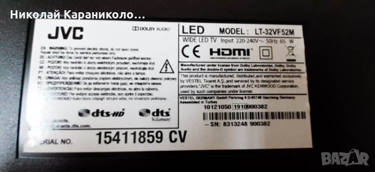 Продавам тв JVC LT-32VF52M за части по причина-дефектна матрица/VES315UNDX-2D-N21/.Редовни съответно: