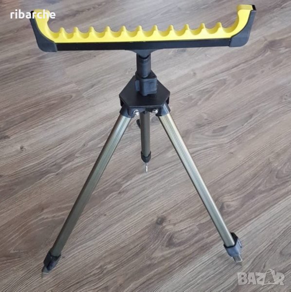 Качествена алуминиева стойка-трипод, лека и стабилна с компактни размери в комплект с фидер гребен с 12 гнезда . Стойката е с регулируеми телескопични крака, фиксираща се на произволна височина до 110 см.С универсална резба за монтирането на различни видове глави , гребени, бъзбарове ,дори и сигнализатори. Куката в средата осигурява допълнително фиксиране на триногата, както може да се ползва и за закачане на кантар. Триподът се ползва най често за фидер, шаранджийски или морски риболов.Транспортната му дължина е 70см