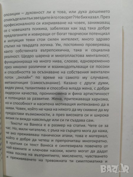 Ванеса Виденова се справя със състоянията на тревожност без лекарска намеса или прием на медикаменти. Промяната на начина на живот и на мислене, социализацията, визуализацията, различните техники за дишане и медитацията, спортът, общуването с природата се оказват нужния лек за душата. Те са средствата, чрез които да се преодолее духовната криза и вътрешната неудовлетвореност – основните причини за епизодите на паническата атака – и чрез които да се преобразува страха в двигателна сила.