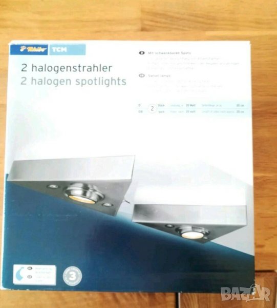 Има 2 триъгълни халогенни прожектора (комплект) на марката TCM от Tchibo. Подходящи за целенасочено осветление на работни повърхности (кухня) . Комплектът е неизползван и в оригиналната си опаковка. Мощност на излъчвател: 20W Дължина на страната приблизително 20 см