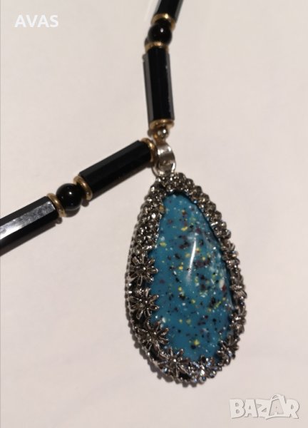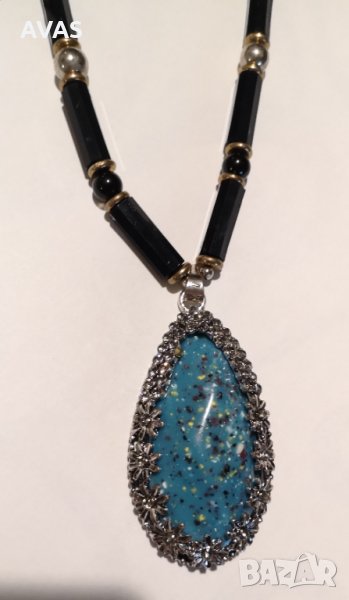 Нов дълъг гердан/медальон, син, капковидна форма. Върху поло, пуловер, блуза може да се носи като украшение. През глава се облича