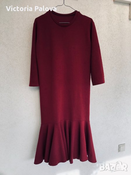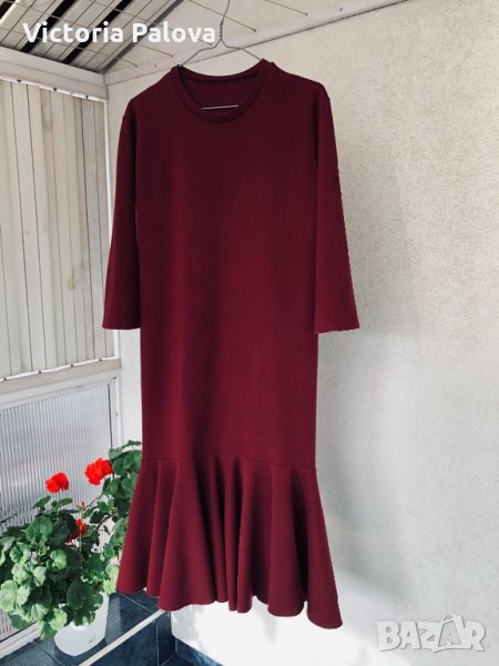 Роклята е много красива и комфортна,за М и L и дори и за малък XL.плътен гладък трикотаж,не описва неравности по тялото.рамене-44см,гръдна обиколка-50см,ръкав 3/4-43см,към ханша има малко разширение-52-53см,цялата дължина е113-114см,до шева е 80см.има разтегливост.