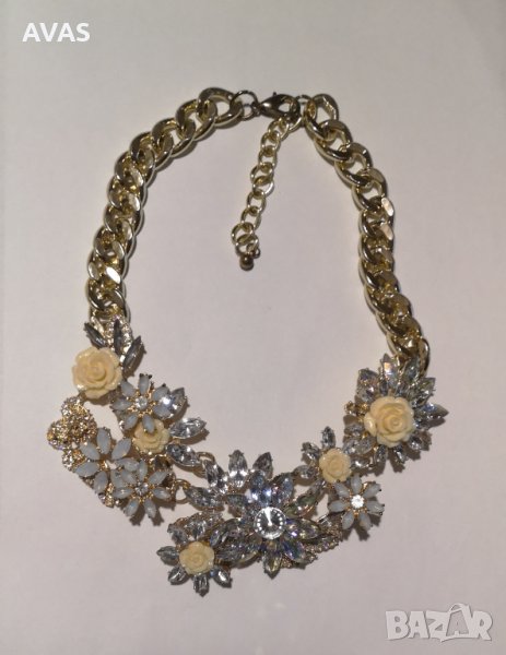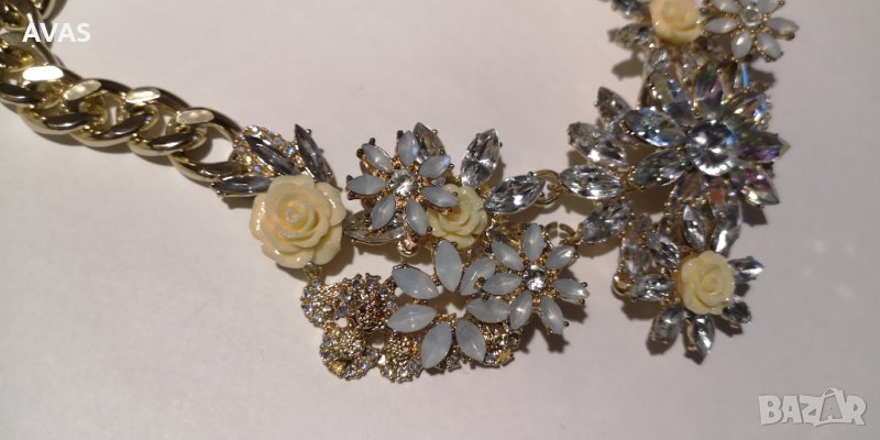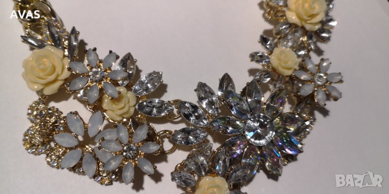 Нова огърлица с жълти и бели цветя с камъчета и кристалчета, пишна, със златист синджир