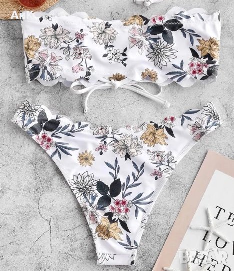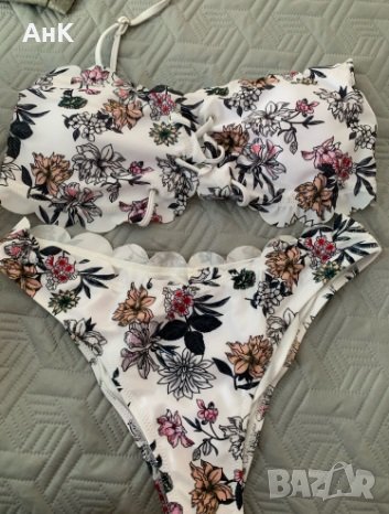 Чисто нов бански костюм в бяло с цветенца, с връзки отпред, размер М.