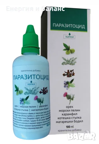 Състав: екстракти от обвивки на зелен орех, морски пелин, карамфил, котешка стъпка, магарешки бодил.