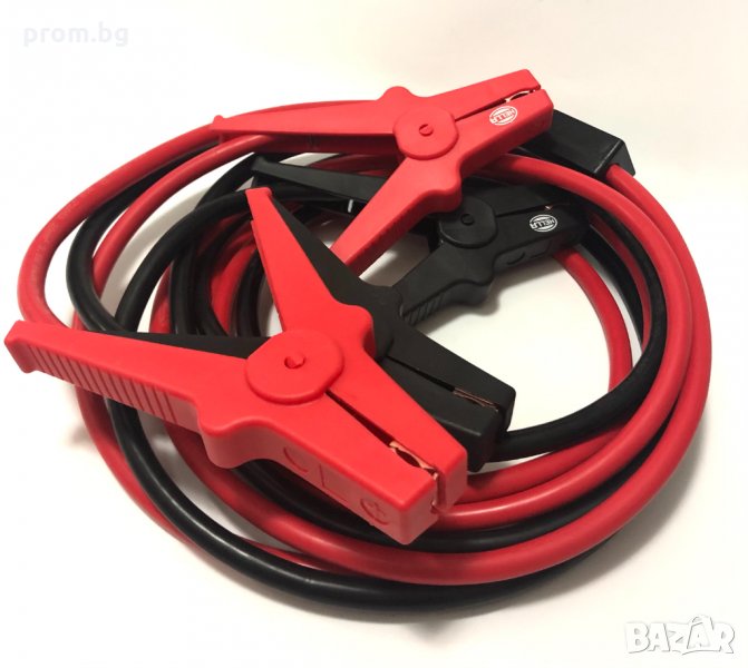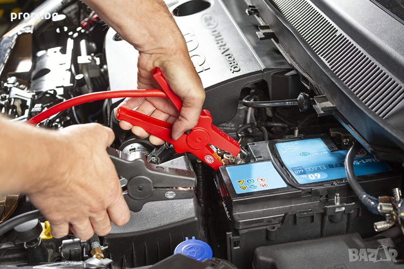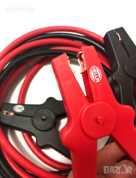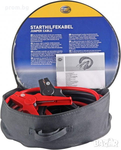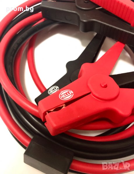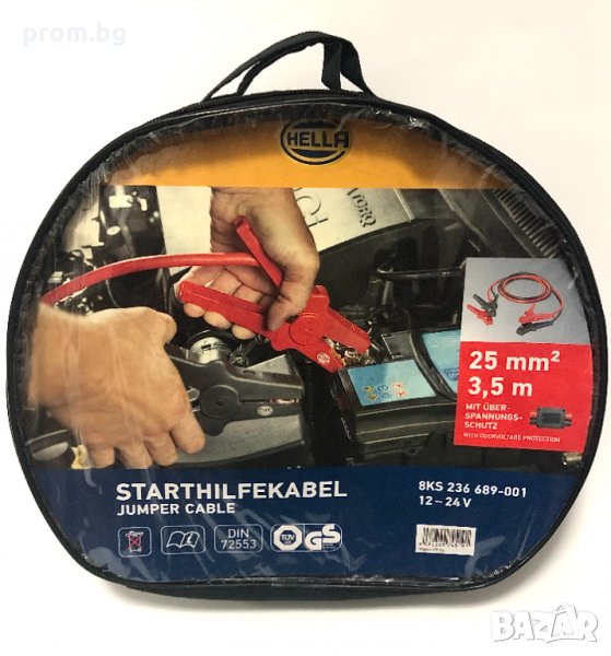стартови кабели Hella, 12V/24V, Германия. Сила на тока: до 350 A; Подходящи за бензинови двигатели: 5500 ccm и дизелови двигатели: 3000 ccm. Напречно сечение на кабела: 25 mm², дължина на кабела: 3,5 m.