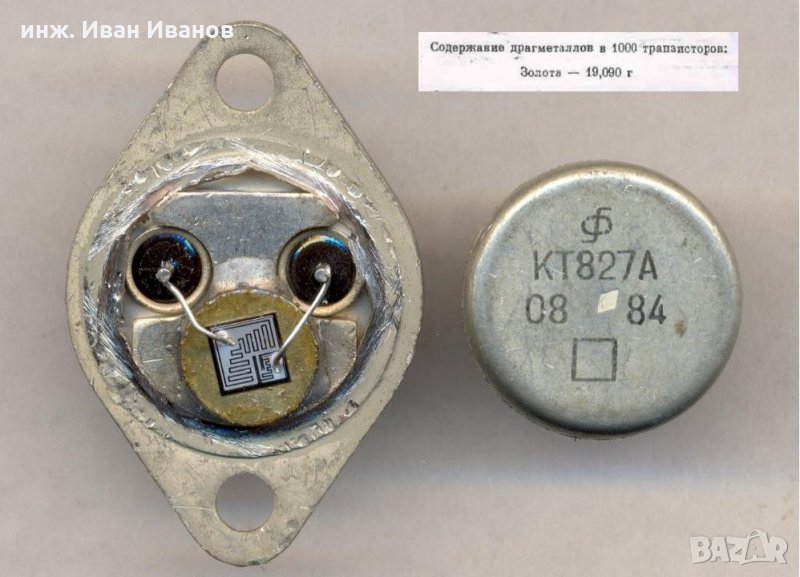 Содержание драгоценных металлов в транзисторе КТ827А. Золото: 0,017 грамм. Серебро: 0 грамм. Платина: 0 грамм. Палладий: 0 грамм.