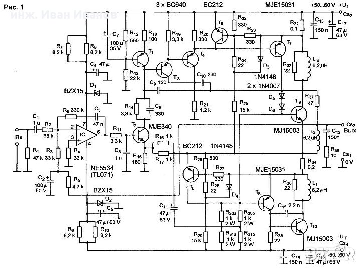 Коментар: Ако искате да си направите усилвател на мощност с Дарлингтонови n-p-n транзистори КТ827А, то легендарният усилвател “QUAD 405-2” работи с "дарлингтони" най-добре. На последната снимка е дадена схемата му. На входа е най-добре да използвате малошумящ операционен усилвател NE5534 със схема за нулиране на изхода. Резултатът е фантастичен.... “QUAD 405-2” има особен вид LRC мост, който връща нелинейните изкривявания на входа и ги подава с обратна фаза към изхода. В резултат противофазните изкривявания се нулират и оттам се получава особено качественият звук с който този усилвател е известен.
