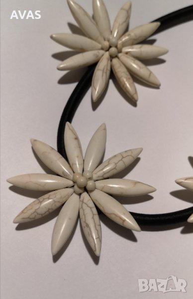 Ново дамско колие. Черна плътна широка верижка, декоративни цветя маргаритки от събрани елементи като от слонова кост. Закопачаване на врата. Едро и ефектно