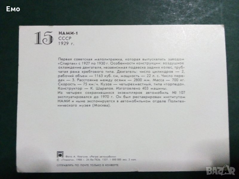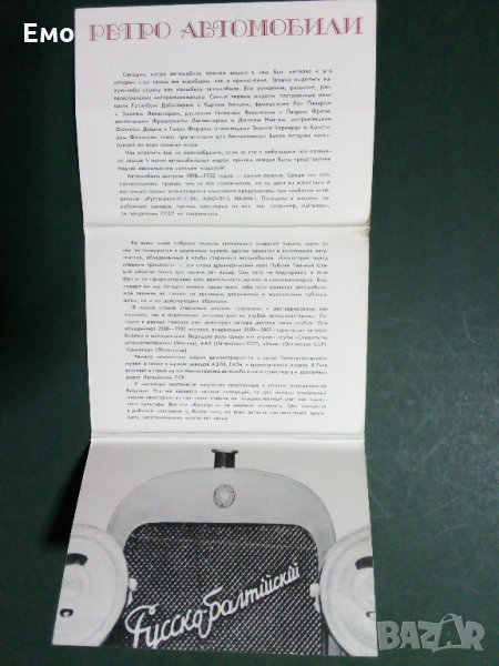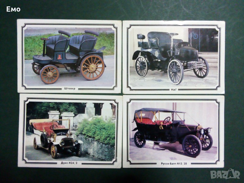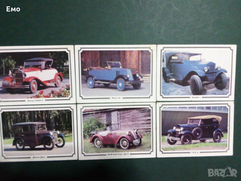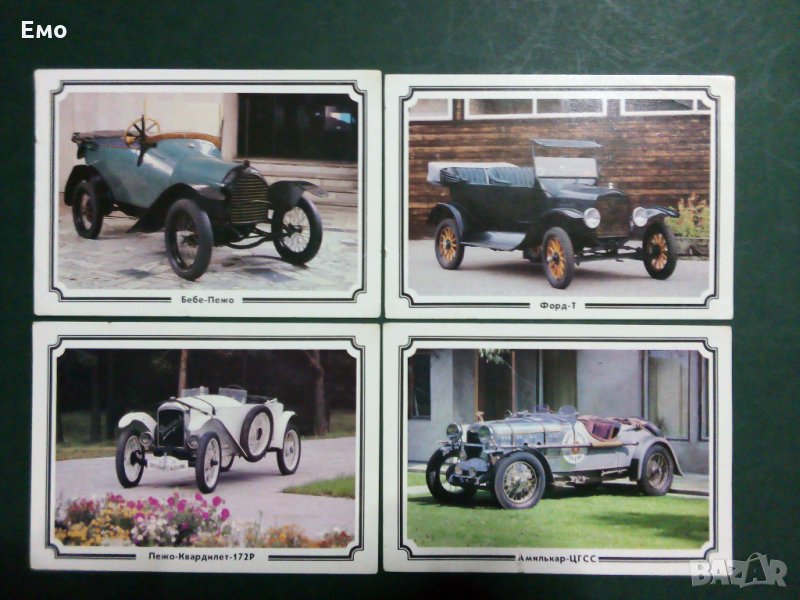 картички, закупен в тогавашния СССР през 1989-1990 г. Съдържа ефектна обложка (с подробно изложение и информация за поредицата - на снимка №2) и 18 бр. картички на ретро автомобили. Всяка една от тях има спецификации и история на модела на гърба, като за пример как изглеждат се вижда на снимка №7.