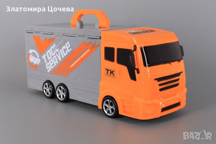 Камионът е снабден с дръжка и може да се носи като куфарче. Размери на камиона- 40*18*14 см. Размери в разтворен вид-54*28*30. Размери на колата-15.5*7*4 см. За деца над 3 години