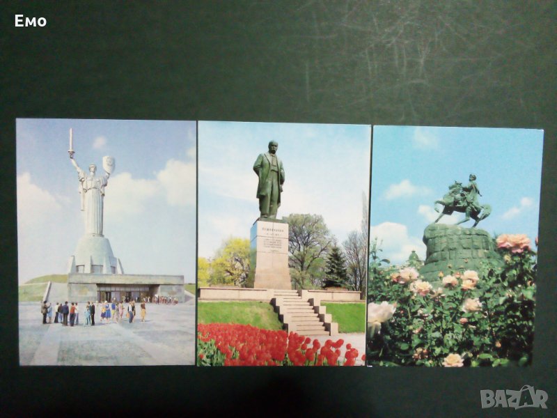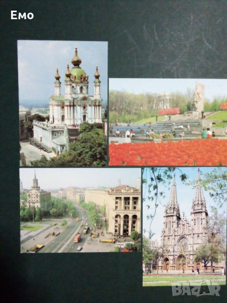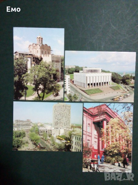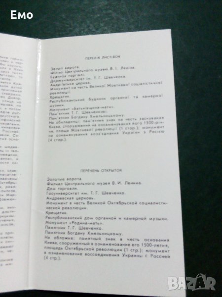 1. Комплект (снимки от 1 до 7) от ефектна обложка (с подробно изложение и информация за поредицата - на снимки 2 и 3) и 11 бр. картички на културни, исторически и архитектурни забележителности в столицата на Украйна - Киев. Всяка една от тях има описание на гърба, като за пример как изглеждат се вижда на снимка №7. Цена: 35 лв.