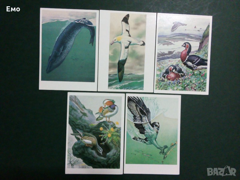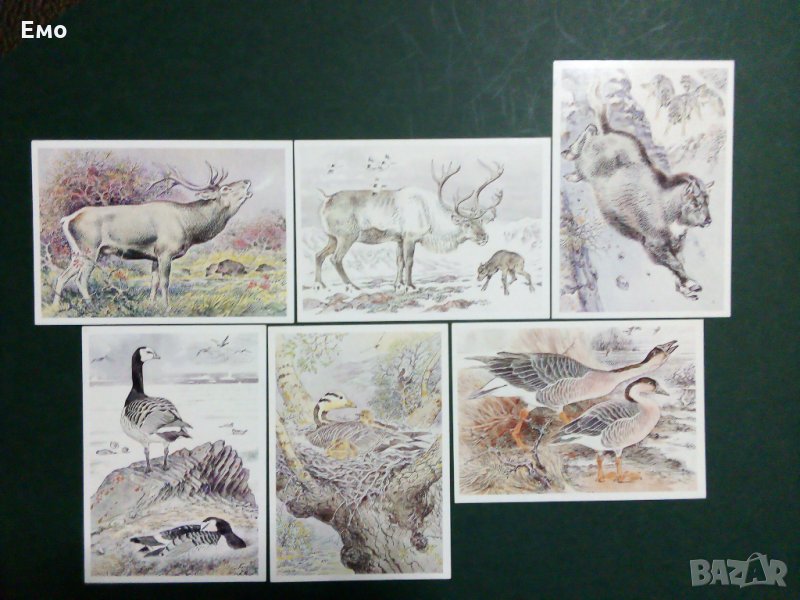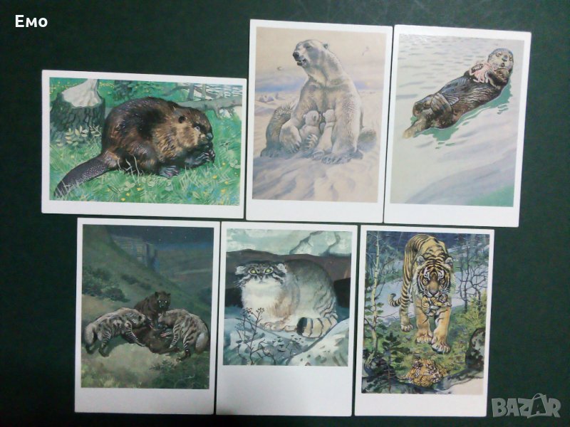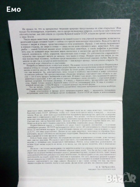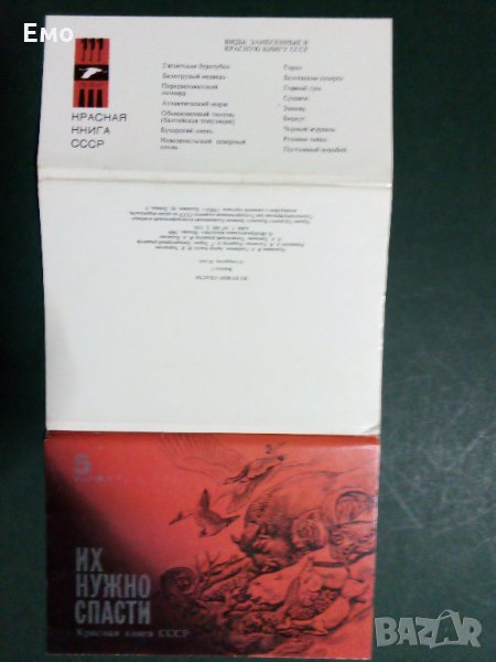 1. Комплект (снимки от 1 до 6) от ефектна обложка (с подробно изложение и информация за поредицата - на снимка №2) и 16 бр. картички на застрашени от изчезване видове животни от "Червената Книга на СССР"(1-ва част). Всяка една от тях има описание с история за съответния вид, като за пример как изглеждат се вижда на снимка №6. Цена: 65 лв.