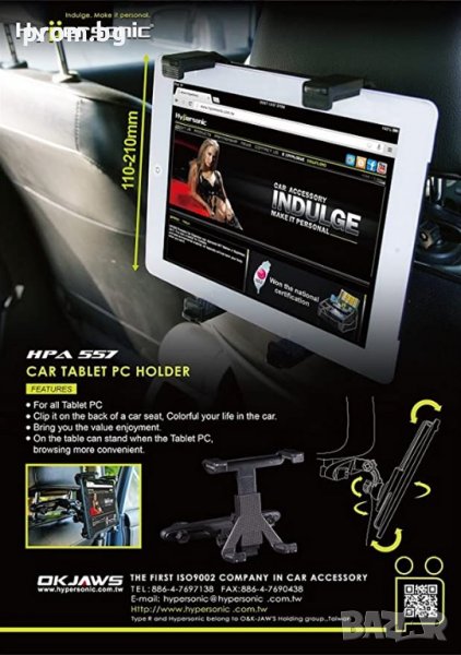 универсална стойка за таблет за задна седалка на автомобил, Hypersonic. Подходяща също за електронна книга и iPad. Модел HPA 557 е подходяща за таблети, електронни книги и iPad с максимални размери 210mm*145mm*65mm, Устройството се захваща на 4 места. Hypersonic е Тайванска марка за производство на качествени авто аксесоари. Тегло 260 гр.