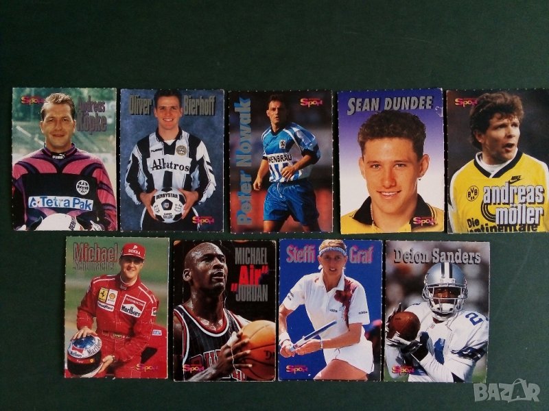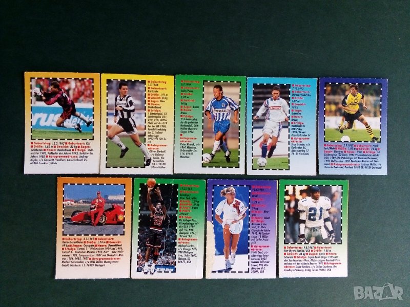 - Големи (колкото карти за игра) луксозни картонено-гланцирани картинки със топ-спортисти. Единствените в обявите ми, които не са от дъвки или албум - отделени са от книжка-приложение. На снимка 12 е показан гърба с подробно инфо за всеки (на немски). - МИХАЕЛ ШУМАХЕР И ОЛИВЕР БИРХОФ СА ПРОДАДЕНИ!