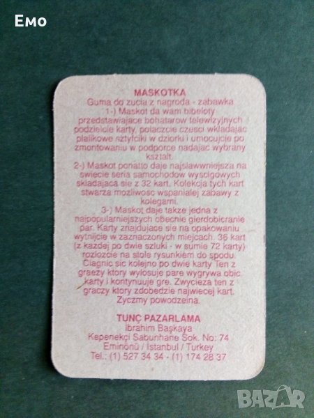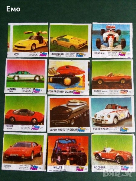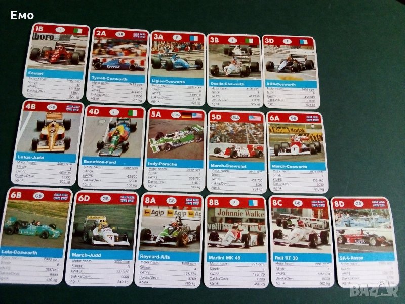 - Състезателни болиди, картонено-гланцирани (от дъвки) с подробни данни за модела. На снимка 12 е показан гърба. Налични номера: 1Б,2А,3А,3Б,3Д,4Б,4Д,5А,5Д,6А,6Б,6Д,8А,8Б,8С,8Д.