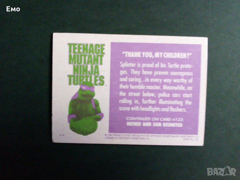 - Серия луксозни картонено-гланцирани (от дъвки) картинки, същинската полу-събрана (от 132 липсват 27 бр.) поредица със сцени от първия игрален филм за Костенурките нинджа - страхотно оформени! По-големи от предходните, колкото карти за игра. На снимка 11 е показан гърба. Налични номера: 2,4,5,7,9,10,11,13,15, 18,20-23,25,27-36,38-45,47-50,52,55,57-64,66-70,72-74,76,78-94, 97,99-103,105-117,119-123,125-127,129-132(финална).