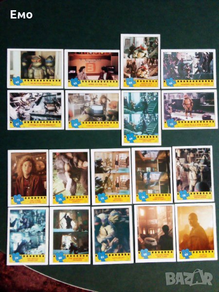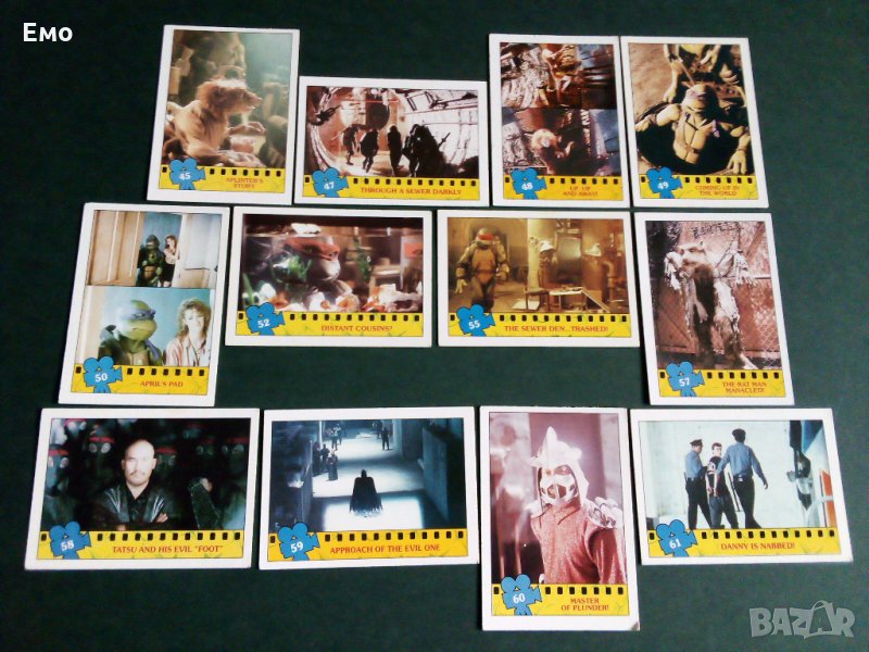 - Серия луксозни картонено-гланцирани (от дъвки) картинки, пред-поредица с героите от първия игрален филм за Костенурките нинджа - страхотно оформени! На снимка 2 е показан гърба. Налични номера: 1;5-9.