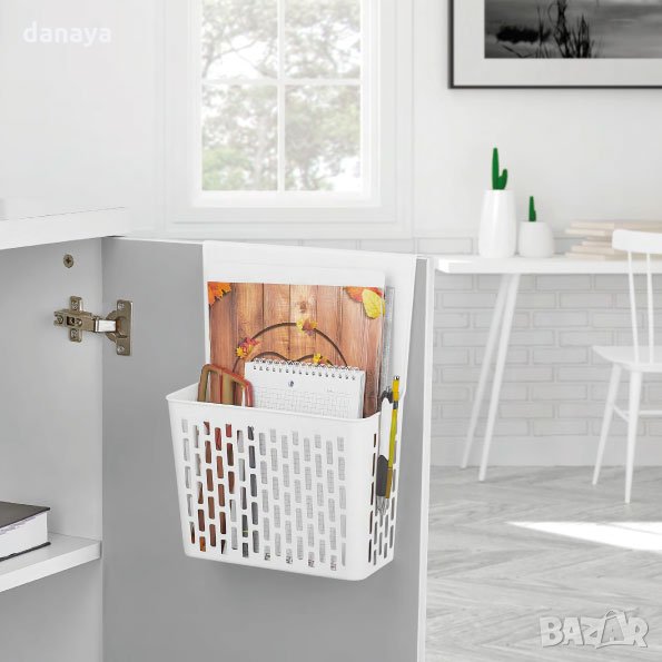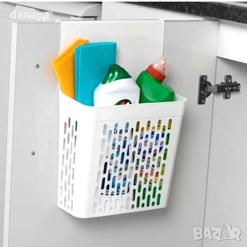Пластмасов органайзер за кухненски прибори, почистващи препарати, бутилки или други вещи, който се закача за вратичка на шкаф. Кошче за закачане, което пести място и държи подредени аксесоарите в кухнята или банята. Може да се постави на вратата на шкафа под мивката в кухнята или банята. Побира много неща. Висяща кошница за врати, кухненски вратички, чекмеджета и други с дебелина на профила до 2см.