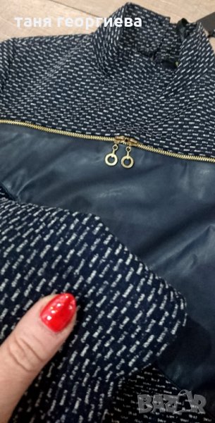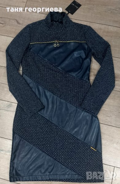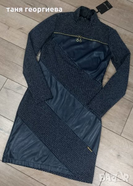 Нова уникална рокля в тъмно син цвят с кожени елементи и декоративни златисти ципове за украса,р-р С-М дълж-88 см бюст-86 ханш-88 см