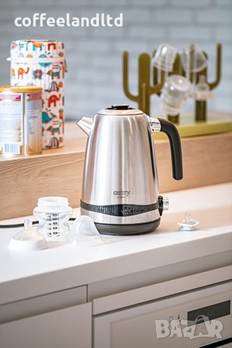Възможността за загряване на вода до 100 ° C и след това настройване на функцията за поддържане на топлината при температура от 40 ° C ще улесни бързото приготвяне на мляко, каши и др. за бебета, които трябва да се хранят през нощта.Каната е изработена от висококачествена неръждаема стомана, оборудвана със защита от прегряване, осигуряваща продължителна употреба на устройството. За лесно почистване на външната част, Camry CR1291 е оборудван с напълно подвижен капак без панти.