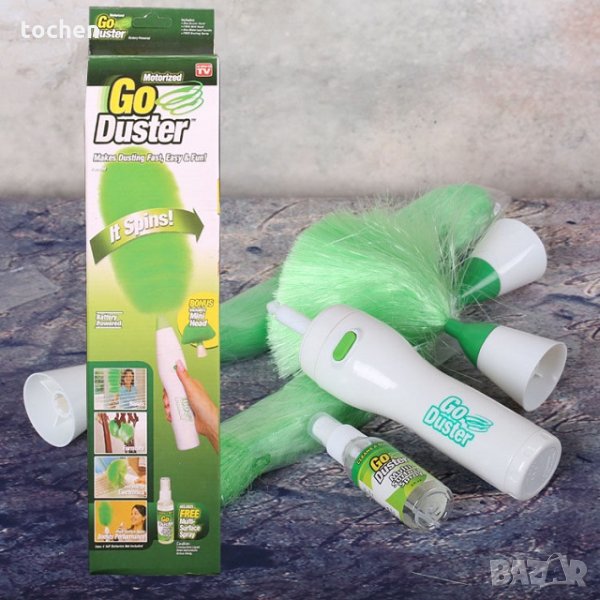 Уредът работи с батерии ( НЕ са включени в комплекта) и няма кабели, които да ти пречат и ограничават!Въртящата се четка за почистване на прах Go Duster е революционно моторизирано средство за почистване на прах - по-бързо, по-лесно и по-забавно отколкото някога си си представяла. Просто натисни бутона и главата на четката започва да се върти и да събира прашинки за секунди.