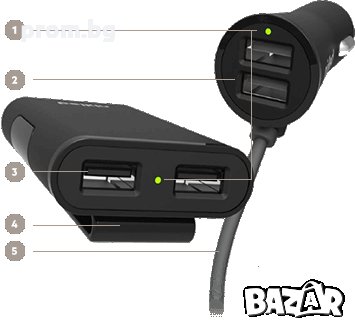 Подходящо за зареждане на устройства на предните и задни седалки, 2 USB порта за предни седалки със споделени 2.4 Amp и 1 двупортов хъб за задните седалки с по 2.4 Amp. Безпроблемно зареждайте 4 устройства едновременно, докато сте в движение. Перфектен за гледане на филми при дълги пътувания. Проектиран с 1.80 м кабел и 4 usb порта.