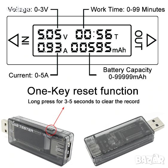 4 в 1 USB тестер, който измерва и показва напрежение (V), консумирания ток (А), капацитет (mAh) и време за заряд (T) с точност до ± 1%. Автоматично запаметяване и показване на стойностите на LCD дисплей. Изключително лесен за употреба.