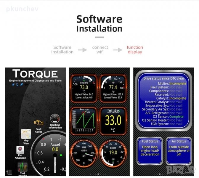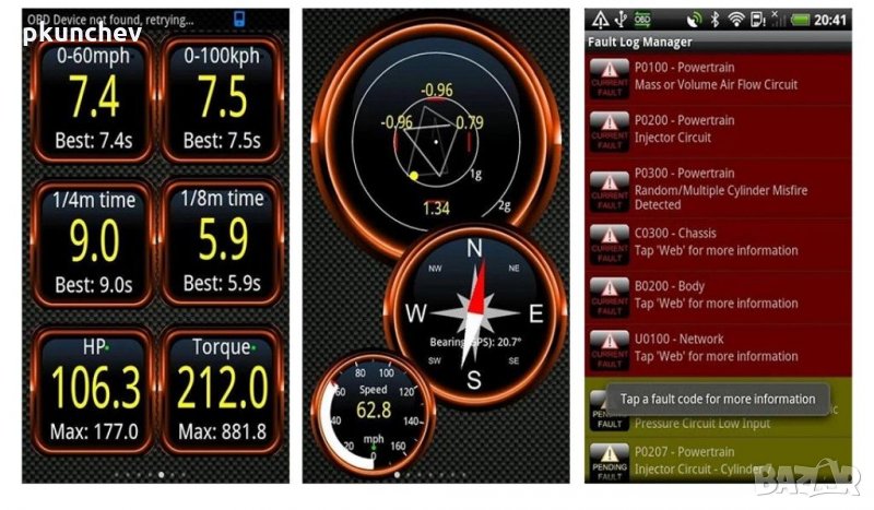 Работи с множество безплатни или платени приложения като TORQUE или други подобни.
