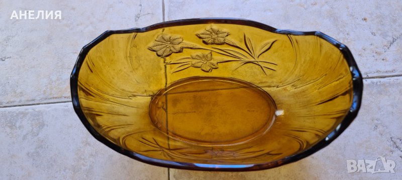 Изискана стъклена масивна ретро фруктиера, цвят карамел с ръчно гравирани флорални мотиви, в отлично състояние.